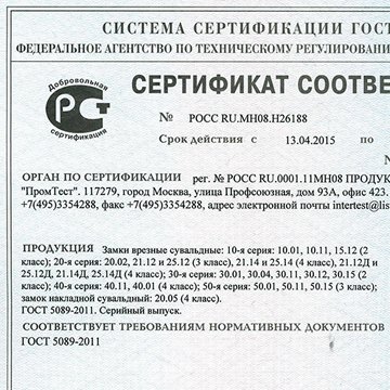 Все замки Гардиан имеют сертификаты соответствия требованиям нормативных документов ГОСТ 5089–2011. Несмотря на отмену обязательной сертификации замочной продукции, мы продолжаем испытывать и тестировать наши замки в известных специализированных лабораториях и центрах. На основании их заключения каждому замку присваивается свой класс защиты.